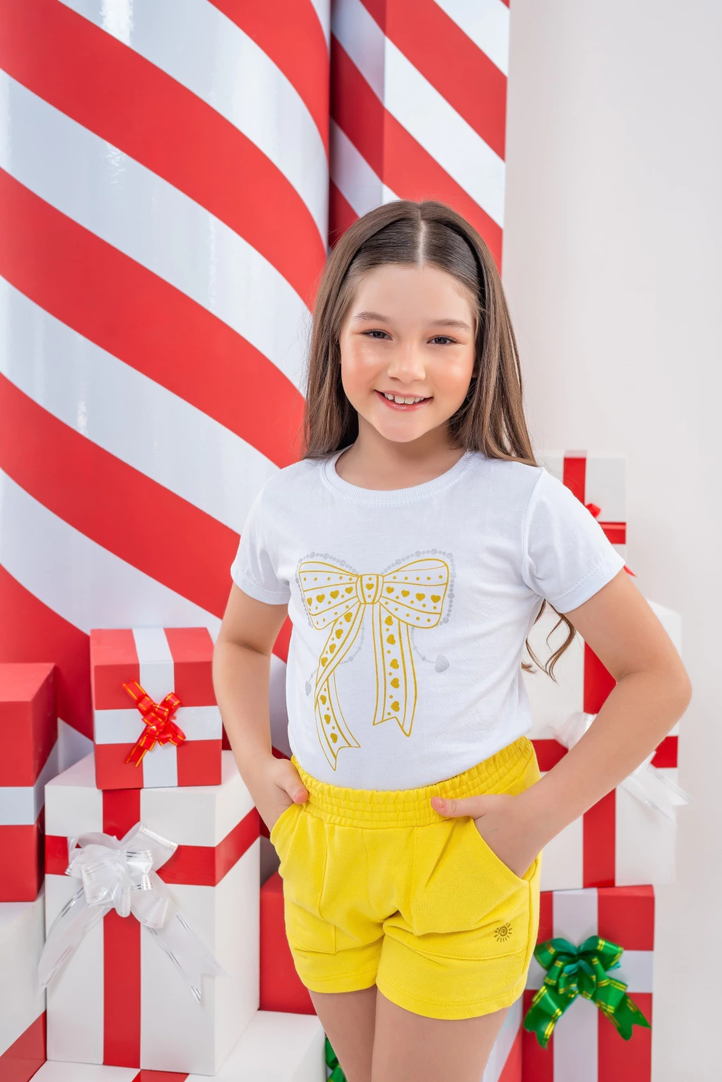 Apresentamos o Conjunto Laço Dourado (BRANCO), a escolha perfeita para o conforto e estilo das meninas! Este conjunto é composto por uma blusa t-shirt 100% algodão com estampa em silk screen e gola em ribana, acompanhada de um short de moletom com bolsos frontais e cós elástico. Disponível nos tamanhos 4, 6, 8, 10 e 12, garante um ajuste perfeito para cada pequena.