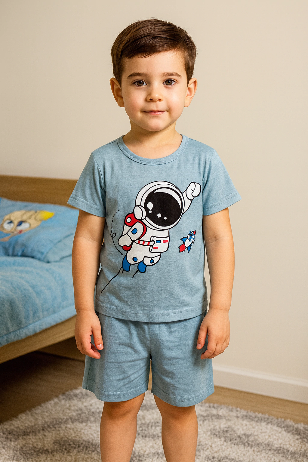 Benefícios: - Conforto: O algodão é respirável e suave para a pele. - Estilo: Estampa divertida do Astronauta que os meninos adoram! - Facilidade: O short com elástico é prático para vestir.