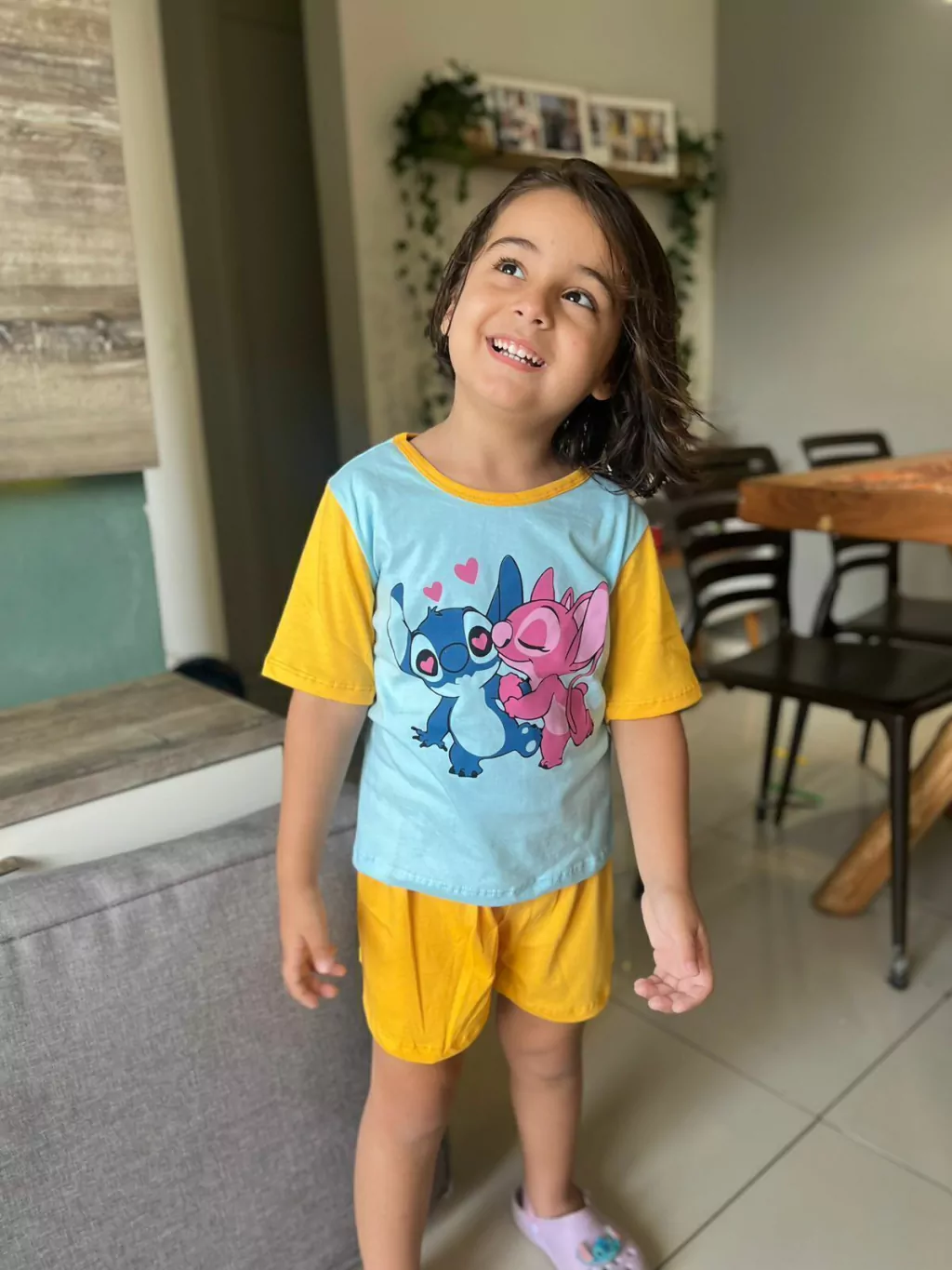 Apresentamos o Pijama Stitch Azul/Amarelo! Este conjunto é perfeito para as noites de sono das suas pequenas. Confeccionado em 100% algodão, ele garante conforto e frescor durante toda a noite.